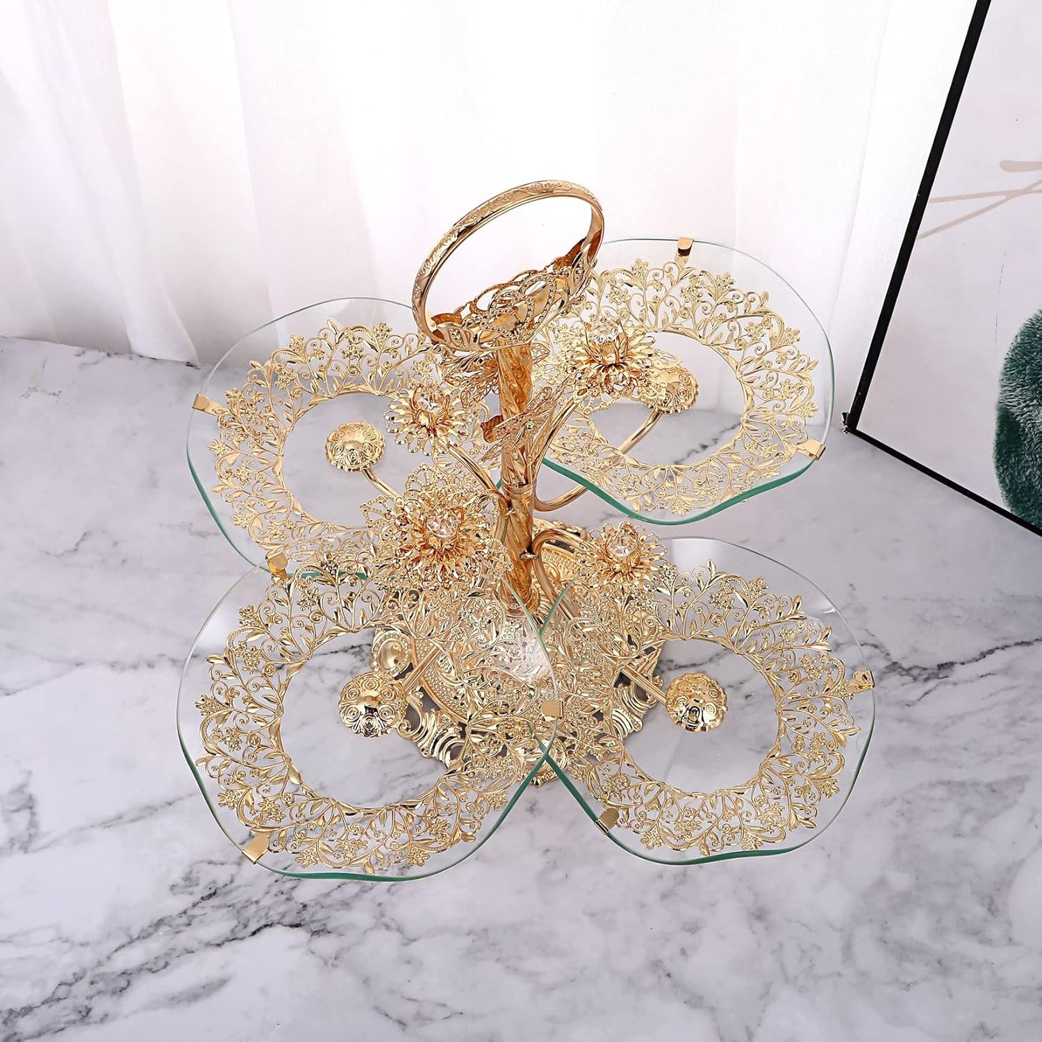 Elegant Design: A stylish 4-tier design with clear glass trays and gold columns. Decorated with metal ivy sculptures, every detail leaves an impressive impression on your guests.