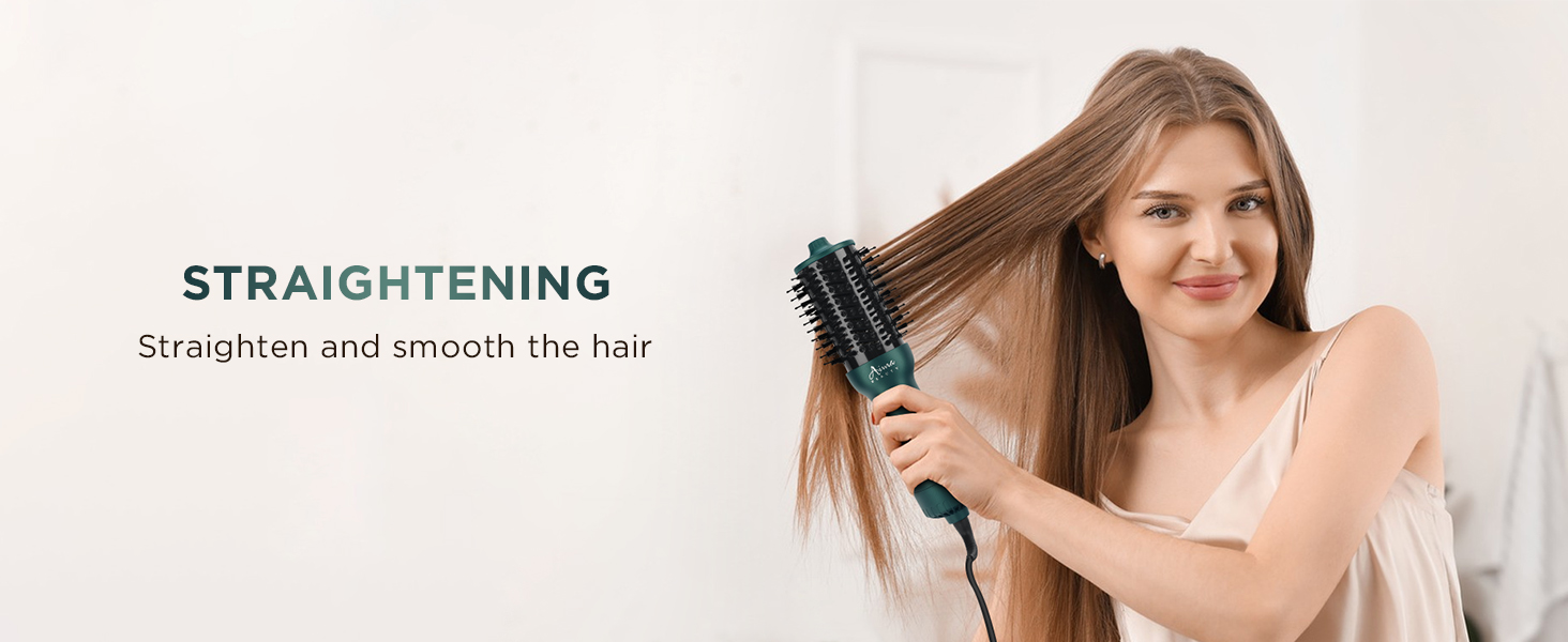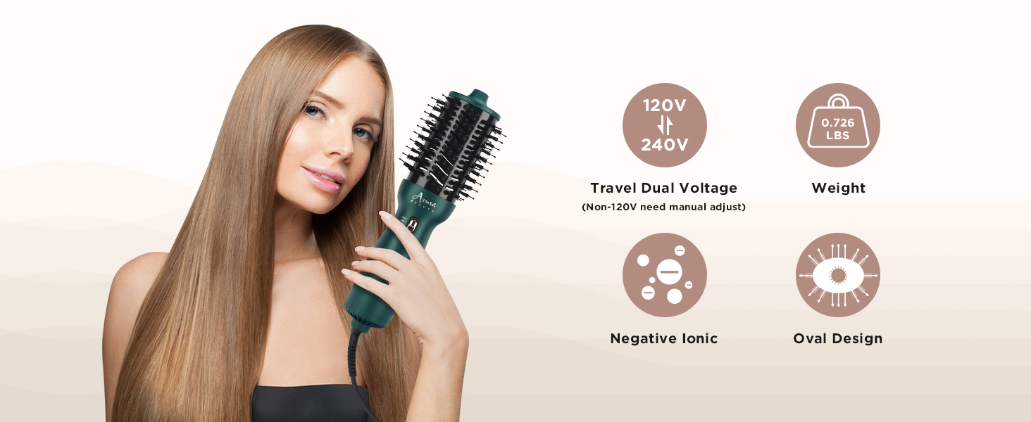 The dual-voltage hot air brush is a versatile travel-friendly tool that adapts to both USA and international voltages, including a free European plug adapter. It heats up quickly, is lightweight, and features a 360° swivel cord for easy use and portability. This 4-in-1 tool functions as a hairdryer, curler brush, straightener, and volumizer, suitable for all hair types. Its negative ion technology and ceramic coating enhance hair moisture, reduce frizz, and add shine. With two speed and temperature settings, it caters to different hair needs, ensuring safety with ETL Certification and an ALCI plug.