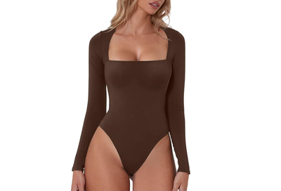 QINSEN Women’s Long Sleeve Square Neck Bodysuit – Double Lined Sexy Shirt Top for Casual or Dressy Outfits