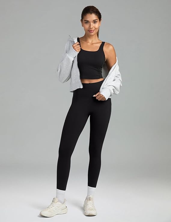 These leggings are made from a soft, stretchy fabric that allows for comfortable movement, whether during workouts or everyday wear. They feature a seamless waistband for tummy control without elastic, side pockets for essentials, and a V-contour seam that flatters the figure. The leggings have an approximate 25-inch inseam and are designed in a 7/8 length.