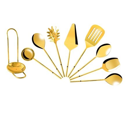 Premium Gold Kitchen Utensils Set featuring 9 handcrafted, food-grade stainless steel tools with an 8 mm forged thickness for durability, rust resistance, and long-lasting performance. Includes a clean, heat-safe spoon rest to keep countertops protected. Fully food-safe, non-toxic, and dishwasher safe for easy care. Part of the Turtle Collection, inspired by nature to symbolize longevity and elegance, with a luxurious gold-plated finish. Beautifully packaged in sustainable materials, making it an ideal gift for holidays, weddings, anniversaries, housewarmings, and special celebrations.