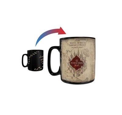 This 16 oz color-changing mug features the Marauder’s Map from Harry Potter. When cold, it shows their catchphrase and footprints. When hot liquid is added, the full map of Hogwarts is revealed. The listing is for one mug, and hand washing is recommended to protect the color-changing effect. It is not microwave safe. The mug is officially licensed.