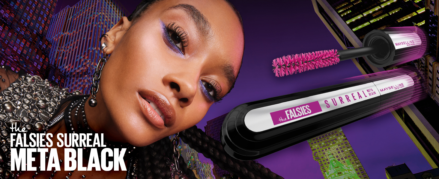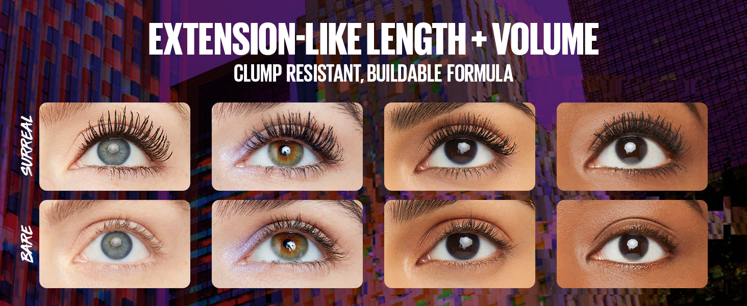 Maybelline’s Falsies Surreal Extensions Washable Mascara provides dramatic length (36% more) and volume (10X) for up to 24 hours. It features Hybrid Fiber technology with an extended helix brush for surreal lash impact. The formula is clump, smudge, flake, and smear-resistant, suitable for sensitive eyes and contact lens wearers, and infused with lash-caring oils. Remove with Garnier Micellar Water.