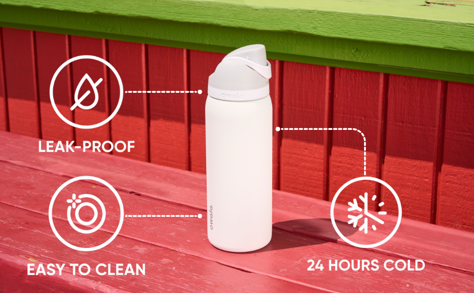 This 24-ounce insulated stainless steel water bottle features a patented FreeSip spout for easy sipping while upright or tilting back to drink from a spout. The protective snap-on lid keeps the spout clean, and the convenient carrying loop doubles as a lock. The double-walled insulation keeps drinks cold for up to 24 hours, and the wide spout makes cleaning and adding ice easy. The bottle is BPA-, lead-, and phthalate-free, and has a dishwasher-safe lid (hand wash the mug). Not suitable for hot liquids.