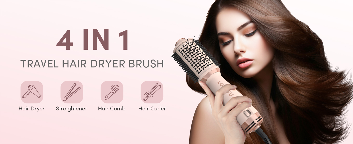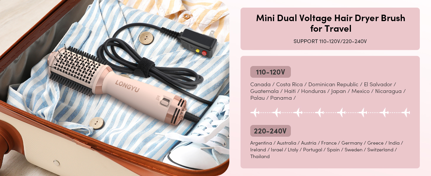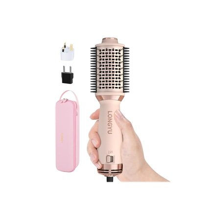 This dual voltage hot air brush is designed for international travel, featuring voltage conversion and EU/UK plugs. It’s compact and lightweight, making it easy to pack. The brush has two types of bristles for volumizing, straightening, and scalp massage. This 4-in-1 tool combines a hairdryer, straightener, curling iron, and comb, saving styling time. It comes with a protective EVA hard shell case and is suitable as a gift.