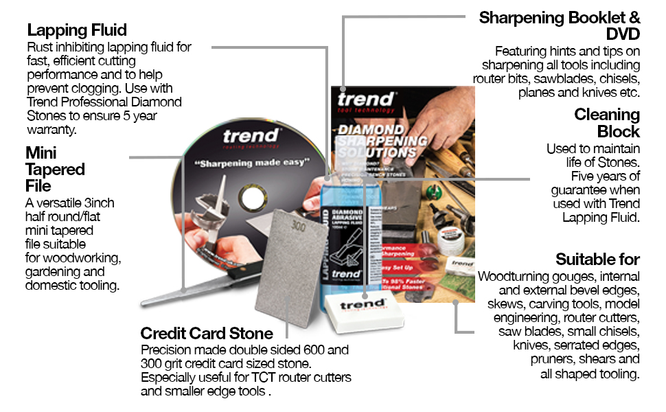 This sharpening kit includes a double-sided diamond stone (600/300 grit), a 3″ mini tapered file (600 grit), Trend lapping fluid, a non-slip mat, a cleaning block, and a sharpening guide booklet. It’s designed for precision sharpening of knives, chisels, and other tools.