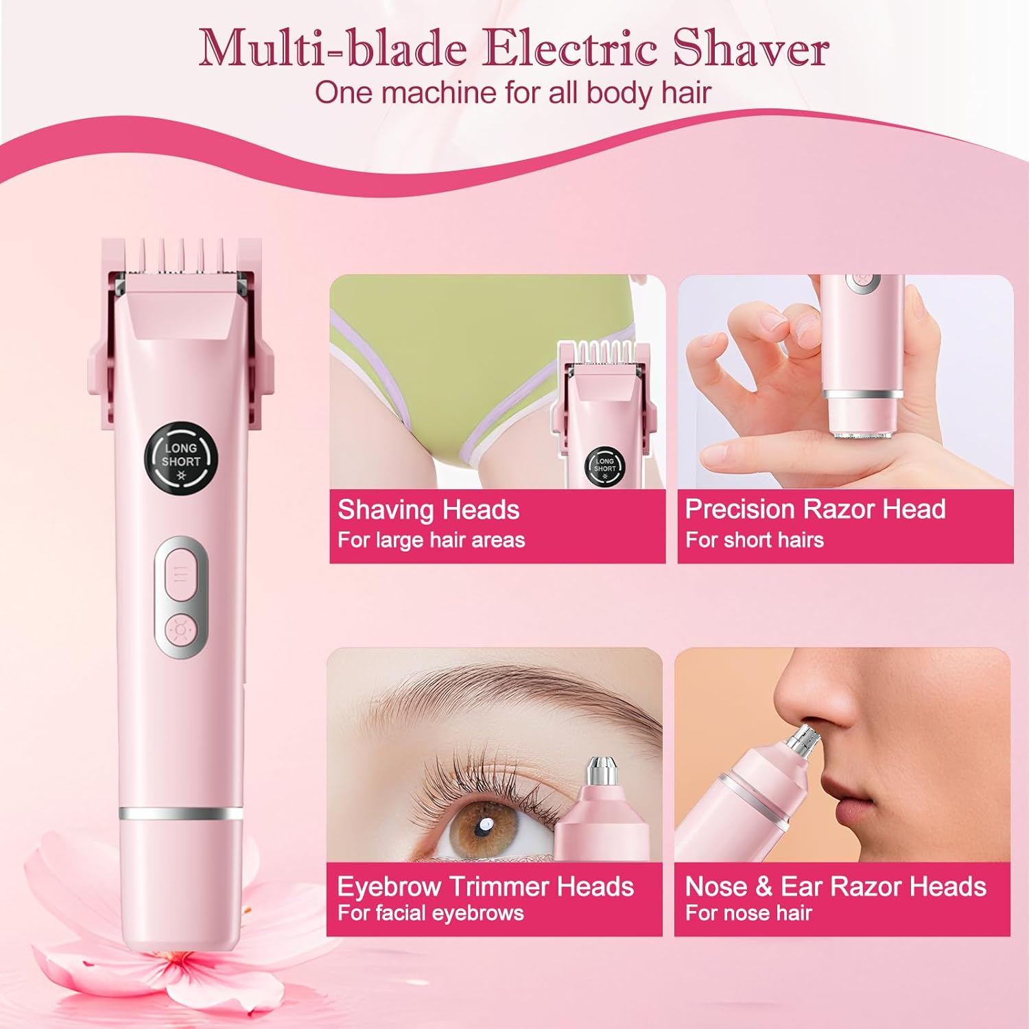 The 4-in-1 Women’s Electric Shaver offers a versatile shaving experience with four interchangeable heads for different areas: legs, arms, underarms, bikini area (shaving head); facial hair like cheeks and upper lip (fine shaving head); eyebrows and forehead hairline (eyebrow trimmer head); and nose/ear hairs (nose and ear blade).